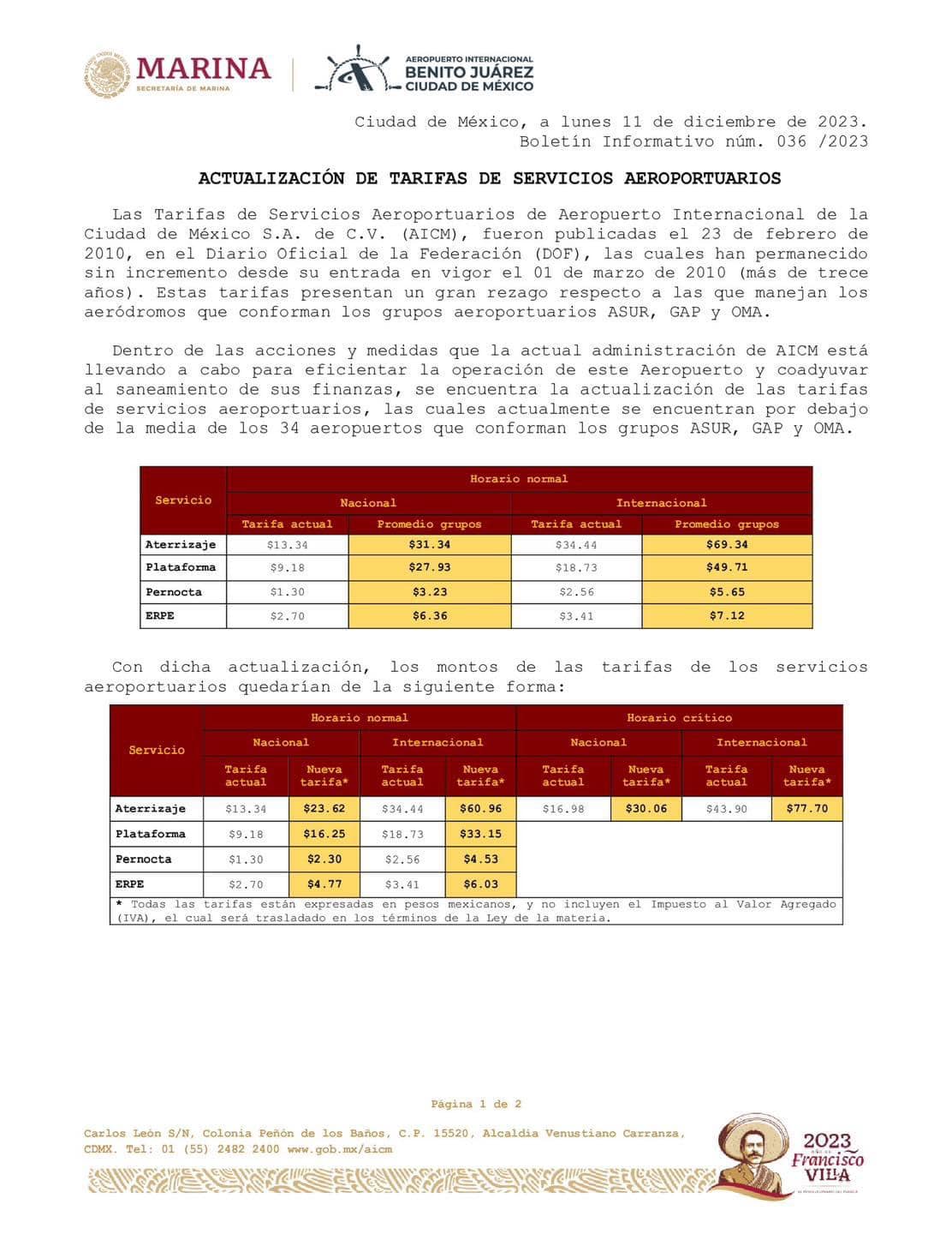El Aeropuerto Internacional de la Ciudad de México (AICM) informó a las aerolíneas que el próximo año aplicará un incremento de 77%, en promedio, a costos de servicios aeroportuarios que son esenciales para la operación, destacó la Cámara Nacional de Aerotransportes (CANAERO).