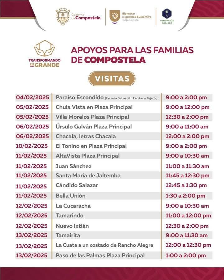 Continúan las visitas de la Dirección de Bienestar e Igualdad Sustantiva y la Fundación Jalisco en las diferentes localidades de Compostela, compartiendo los detalles del programa “Transformando En Grande”, enfocado en brindar apoyos para las familias de nuestro municipio.
