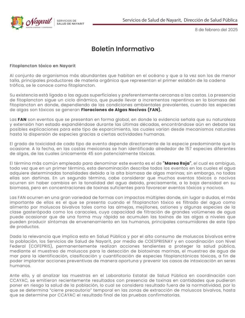 Local EMITEN ALERTA SANITARIA, PIDEN AUTORIDADES NO CONSUMIR OSTIONES EN SAN BLAS POR TOXINA MARINA Por Redacción - 10 de febrero de 2025 1 164 FacebookTwitterWhatsAppTelegram Los Servicios de Salud de Nayarit emitieron una alerta sanitaria pidiéndole a la población no consumir ostiones y moluscos debido a la presencia de fitoplancton tóxico en playas de San Blas.