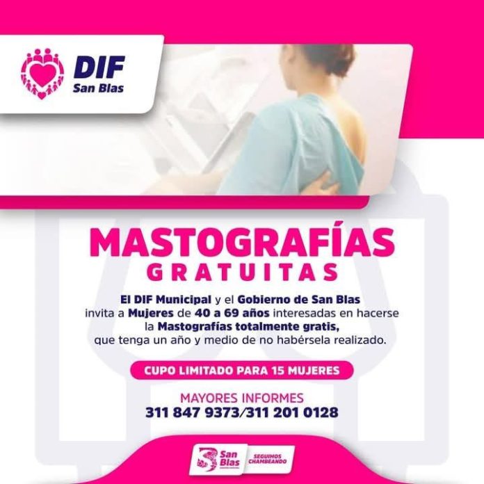 El DIF Municipal y el Gobierno de San Blas invita a mujeres de 40 a 69 años interesadas en hacerse la mastografías ¡TOTALMENTE GRATIS! que tenga un año y medio de no habérsela realizado. Cupo limitado para 15 mujeres.