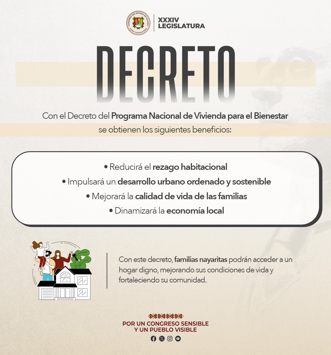 LocalSociales Congreso aprobó el decreto del Programa Nacional de Vivienda para el Bienestar. Por admin - 12 de agosto de 2025 0 127 FacebookTwitterWhatsAppTelegram Para la XXXIV Legislatura, las familias nayaritas son una prioridad; por ello, aprobamos el decreto del Programa Nacional de Vivienda para el Bienestar.
