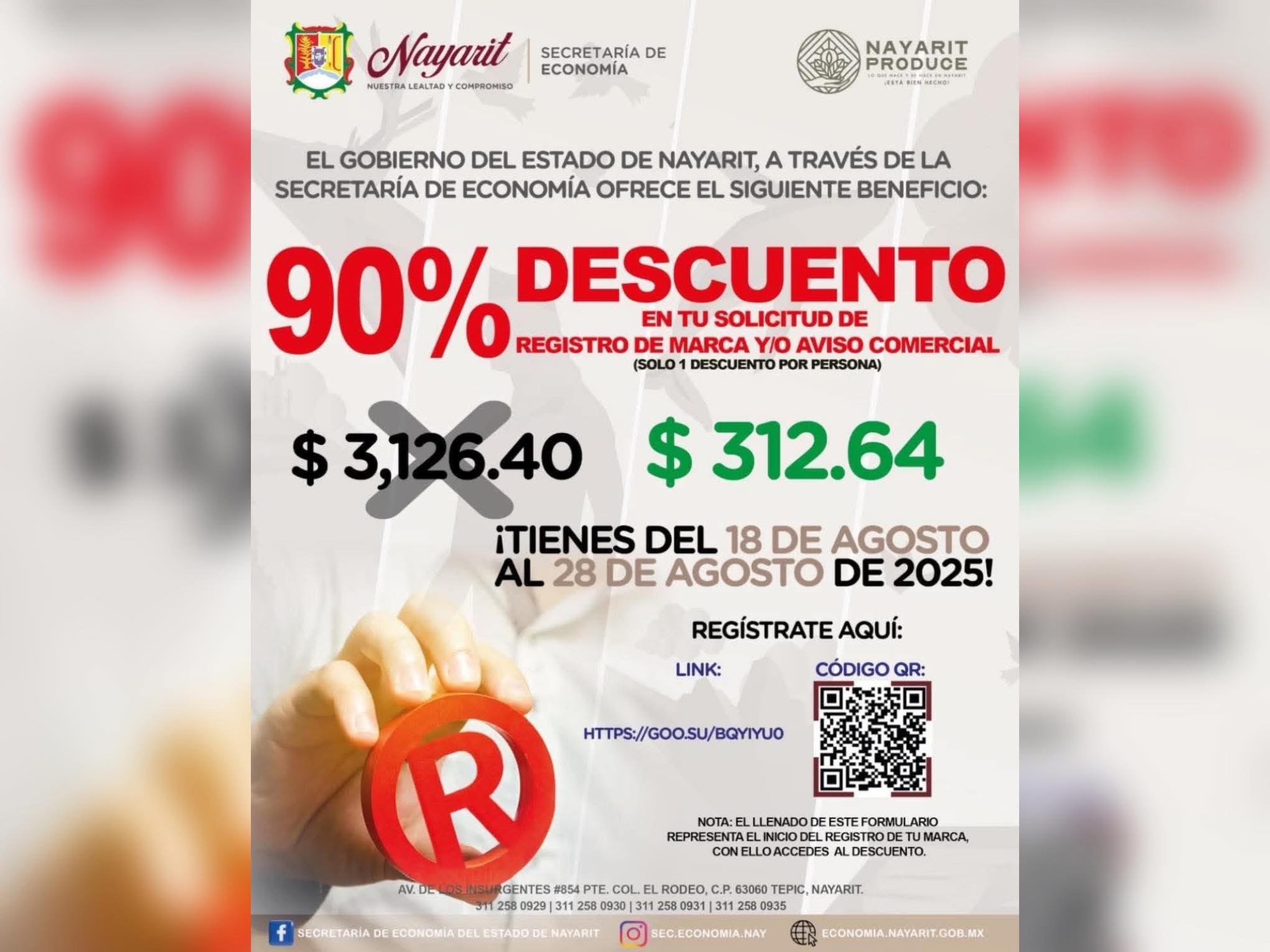 La Secretaría de Economía pone a tu disposición el registro de tu marca y/o aviso comercial con el gran descuento del 90%, de $3,126.40 sólo pagarás $312.64.