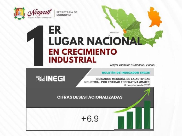 El gobernador de Nayarit informó con orgullo que, de acuerdo con el Boletín de Indicador 549/25 del Instituto Nacional de Estadística y Geografía (INEGI), publicado este 8 de octubre de 2025, el estado ocupa el primer lugar en crecimiento industrial a nivel nacional.