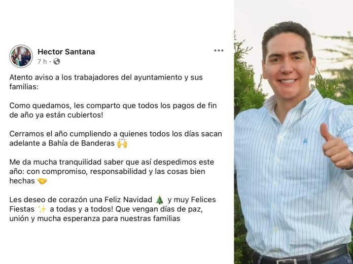 El presidente municipal de Bahía de Banderas, Héctor Santana, informó que todos los pagos de fin de año a las y los trabajadores del Ayuntamiento ya fueron cubiertos en su totalidad, cumpliendo así con los compromisos laborales establecidos.
