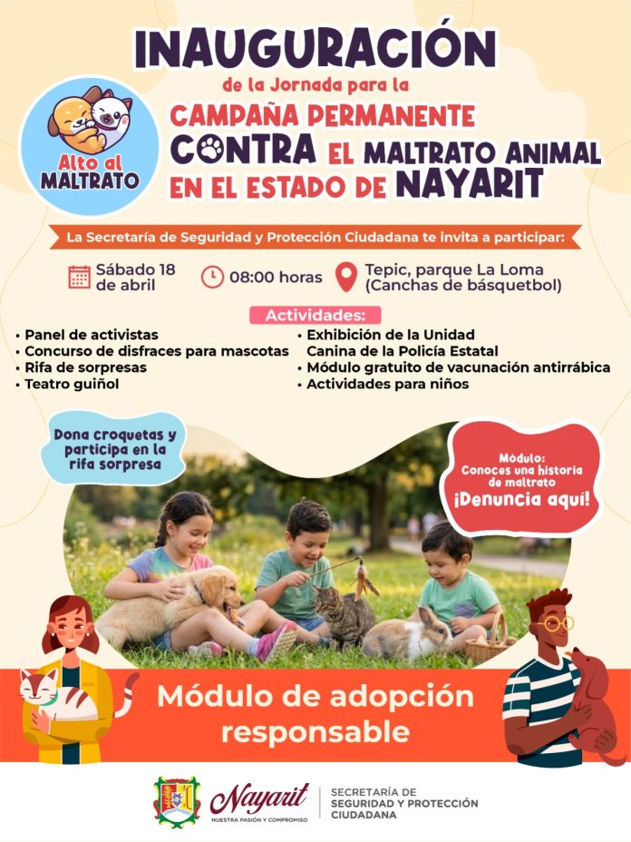 Este sábado 18 de abril, a partir de las 08:00 horas, se llevará a cabo la inauguración de la campaña permanente contra el maltrato animal en Tepic, en las canchas de básquetbol del parque La Loma, una jornada dirigida a toda la familia, con actividades, servicios gratuitos y espacios de concientización enfocados en el bienestar animal.