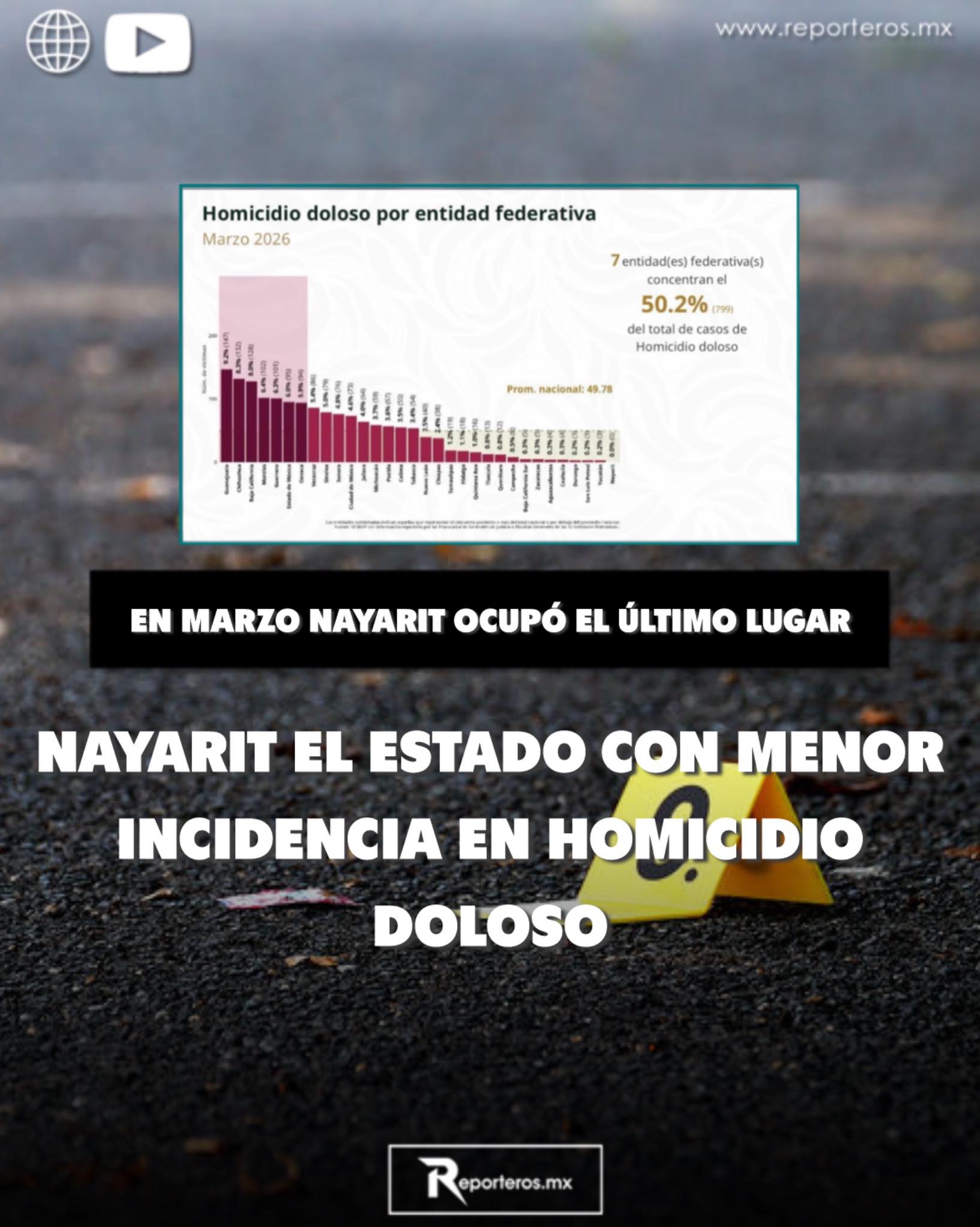 De acuerdo con cifras del Secretariado Ejecutivo del Sistema Nacional de Seguridad Pública, durante el mes de marzo Nayarit se ubicó entre las entidades federativas con menor incidencia de homicidio doloso a nivel nacional.